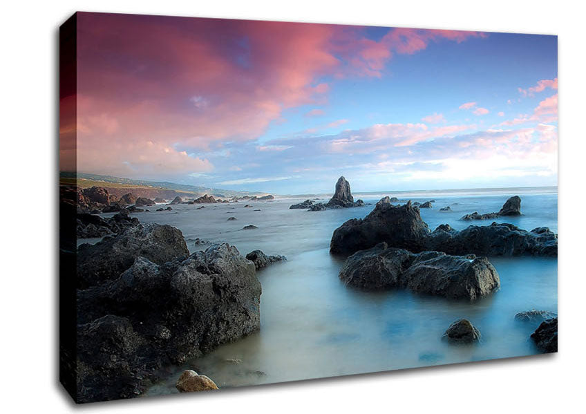 Pink Clouds Over The Morning Ocean Canvas Print handmade in the UK. Stretched over a 2 inch thick wooden box frame, ready to hang on your wall.