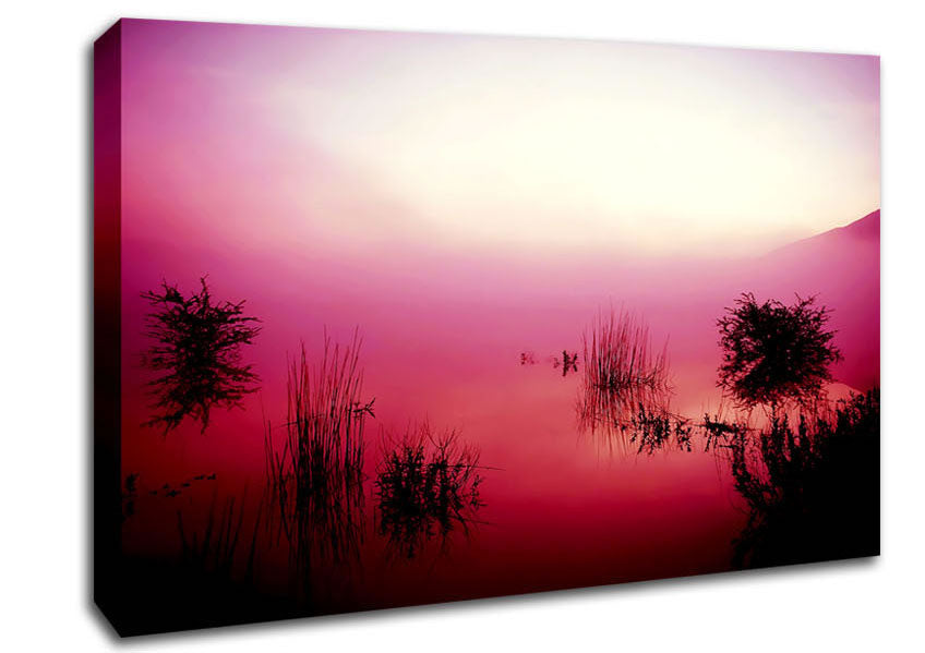 Pink Misty Lake Canvas Print handmade in the UK. Stretched over a 2 inch thick wooden box frame, ready to hang on your wall.