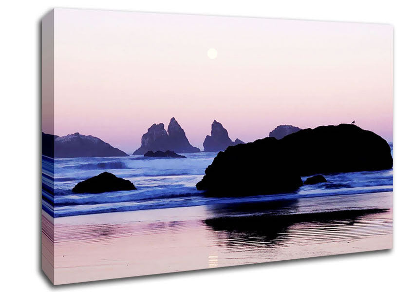 Pink Ocean Moon Canvas Print handmade in the UK. Stretched over a 2 inch thick wooden box frame, ready to hang on your wall.