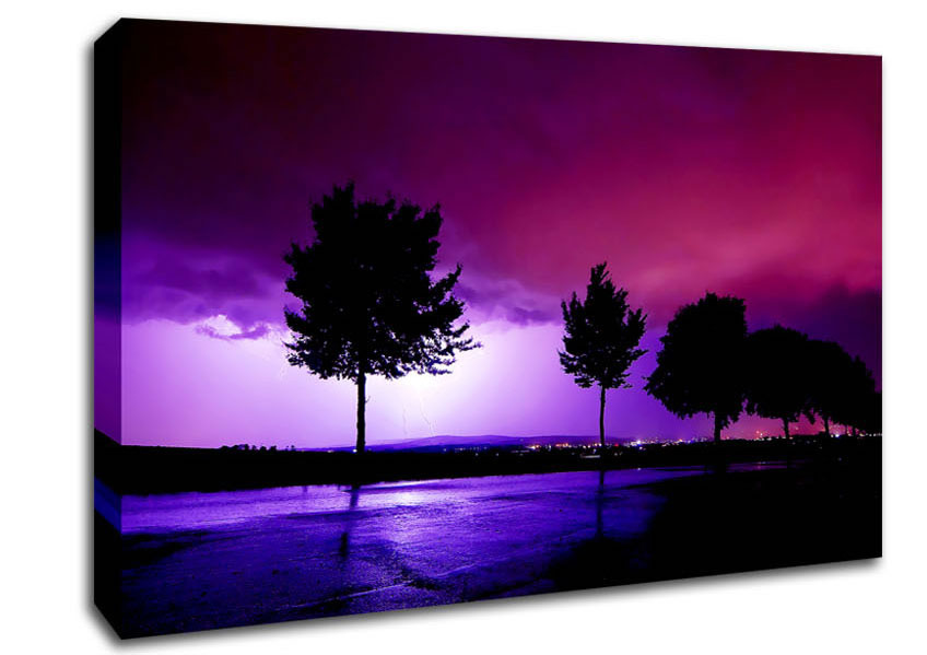 Purple Ocean Lightning Canvas Print handmade in the UK. Stretched over a 2 inch thick wooden box frame, ready to hang on your wall.