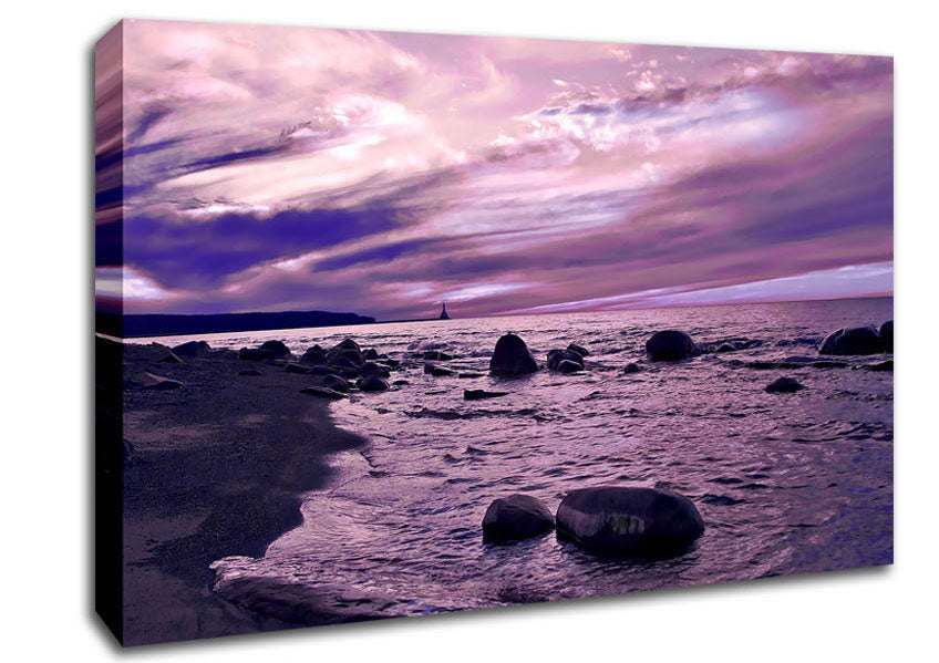 Stunning Lilac Sunset Ocean Canvas Print handmade in the UK. Stretched over a 2 inch thick wooden box frame, ready to hang on your wall.