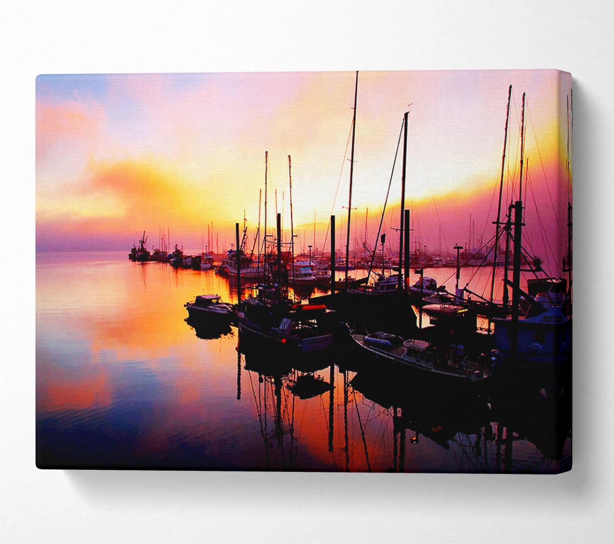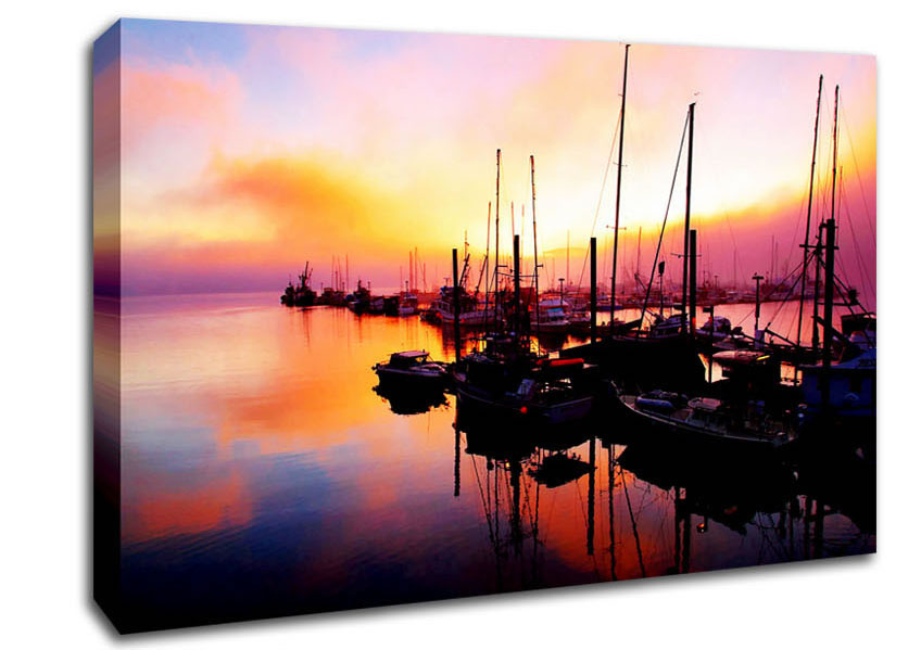 The Harbour At Sunset Canvas Print handmade in the UK. Stretched over a 2 inch thick wooden box frame, ready to hang on your wall.