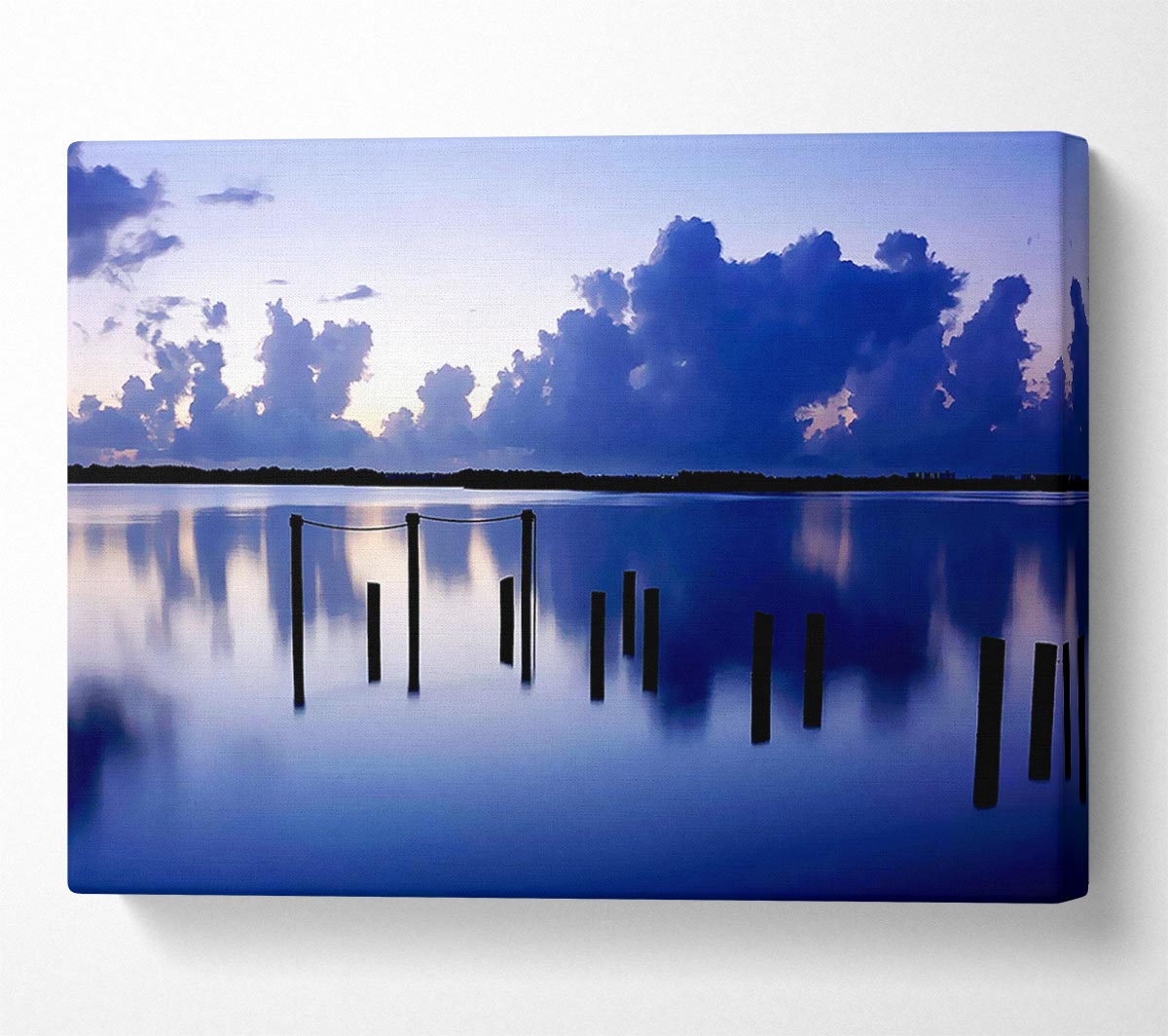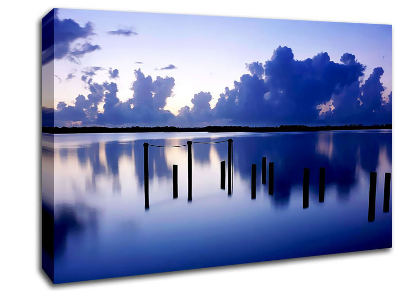 Tranquil Blue Lake Canvas Print handmade in the UK. Stretched over a 2 inch thick wooden box frame, ready to hang on your wall.