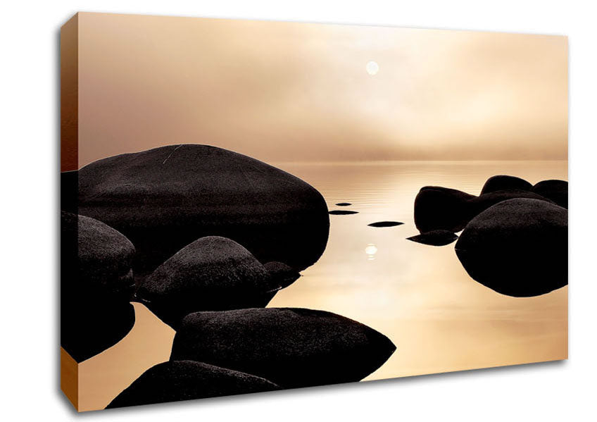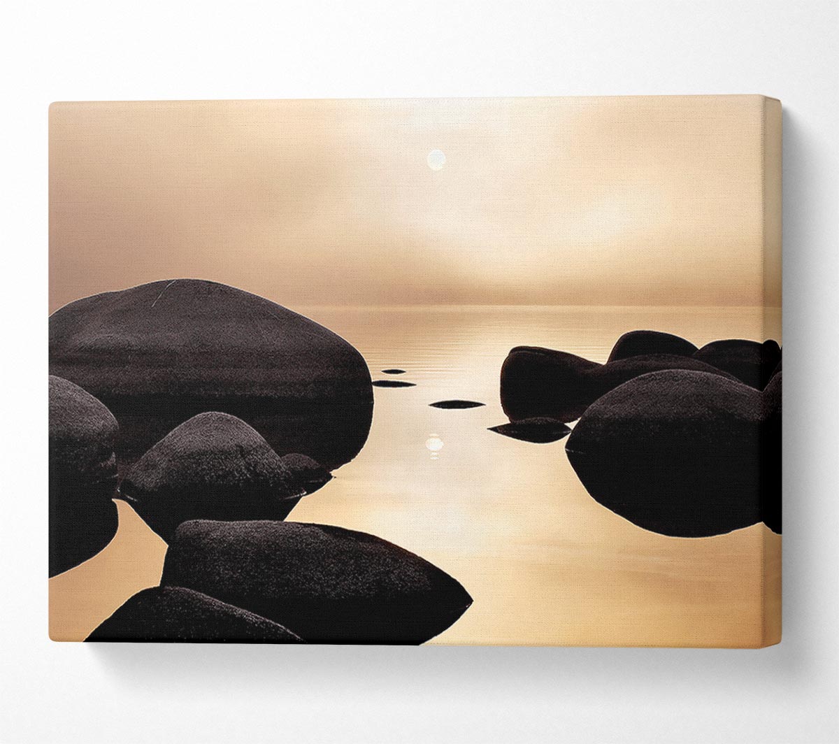 Tranquil Ocean Rocks Canvas Print handmade in the UK. Stretched over a 2 inch thick wooden box frame, ready to hang on your wall.