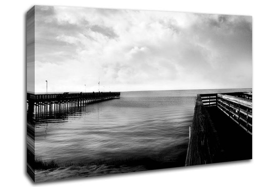 Tranquil Pier B n W Canvas Print handmade in the UK. Stretched over a 2 inch thick wooden box frame, ready to hang on your wall.