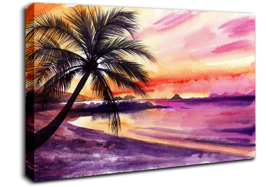 Watercolour Purple Palm Tree Ocean Canvas Print handmade in the UK. Stretched over a 2 inch thick wooden box frame, ready to hang on your wall.