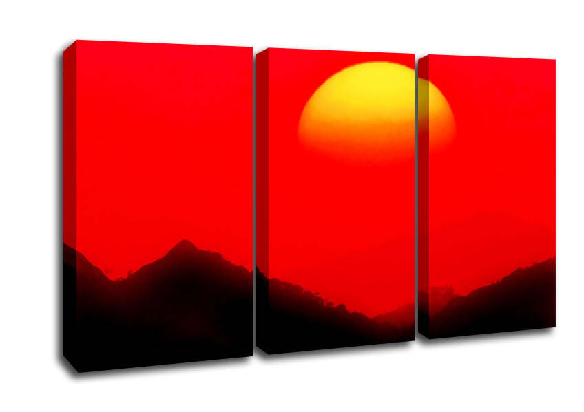 Huge Sun Over The Mountain Tops Red 3 Panel Canvas Print handmade in the UK. Stretched over a 2 inch thick wooden box frame, ready to hang on your wall.