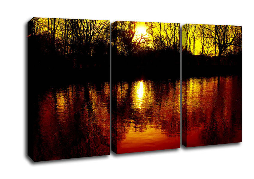 Ochre Lake Reflections At Sunset 3 Panel Canvas Print handmade in the UK. Stretched over a 2 inch thick wooden box frame, ready to hang on your wall.