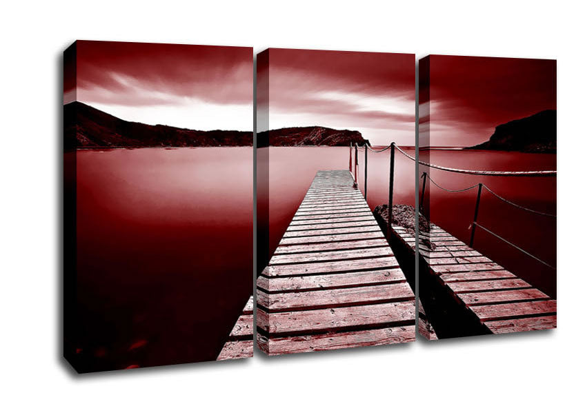 Red Abstract Pier 3 Panel Canvas Print handmade in the UK. Stretched over a 2 inch thick wooden box frame, ready to hang on your wall.