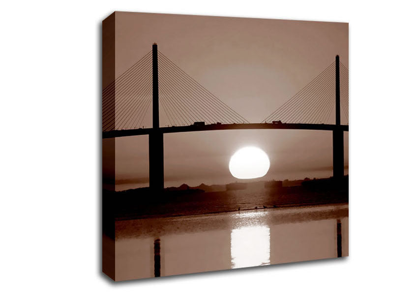 Distant Bridge Sundown Chocolate Square Canvas Print handmade in the UK. Stretched over a 2 inch thick wooden box frame, ready to hang on your wall.