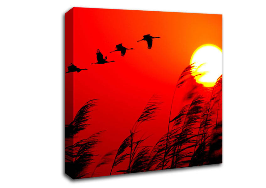 Geese In Flight Under The Red Sun Square Canvas Print handmade in the UK. Stretched over a 2 inch thick wooden box frame, ready to hang on your wall.