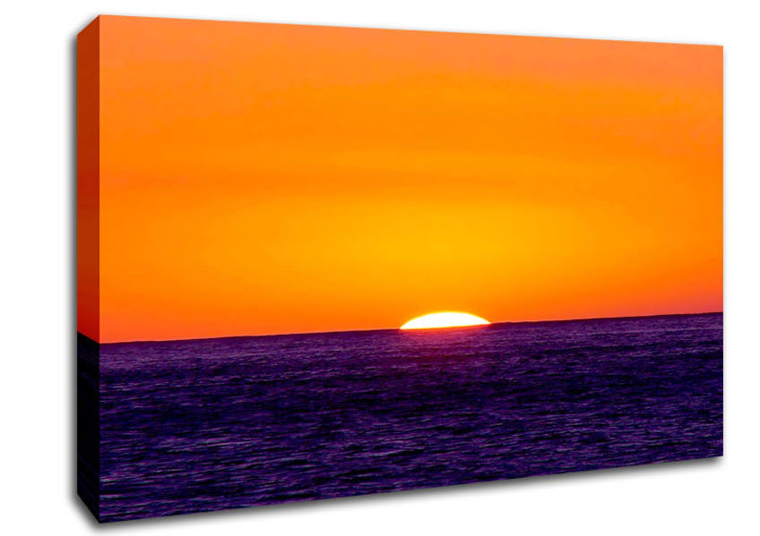 As The Sun Goes Down Over The Ocean Orange Canvas Print handmade in the UK. Stretched over a 2 inch thick wooden box frame, ready to hang on your wall.