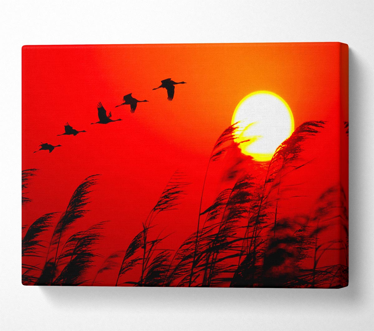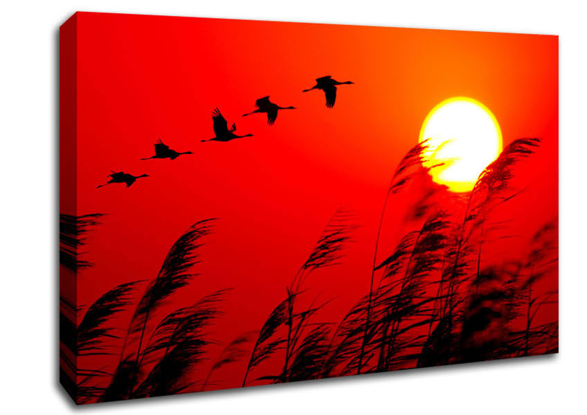 Geese In Flight Under The Red Sun Canvas Print handmade in the UK. Stretched over a 2 inch thick wooden box frame, ready to hang on your wall.