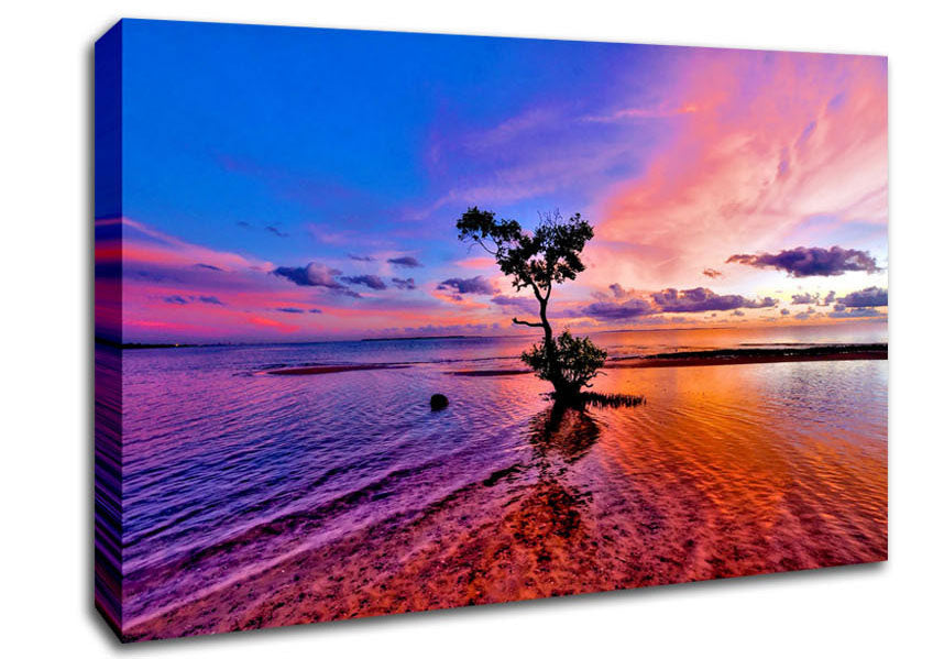 Ocean Tree Dusk Canvas Print handmade in the UK. Stretched over a 2 inch thick wooden box frame, ready to hang on your wall.
