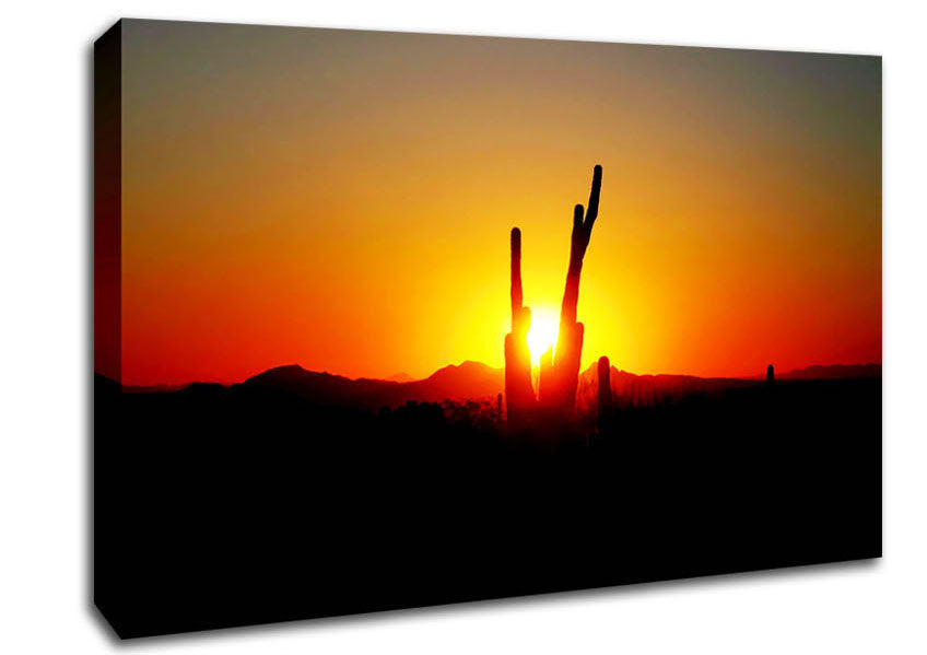 Red Cactus Sunrise Canvas Print handmade in the UK. Stretched over a 2 inch thick wooden box frame, ready to hang on your wall.