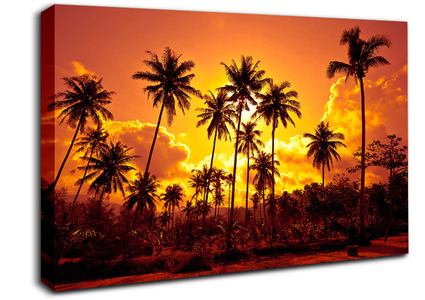 Sun Behind The Palm Trees Canvas Print handmade in the UK. Stretched over a 2 inch thick wooden box frame, ready to hang on your wall.
