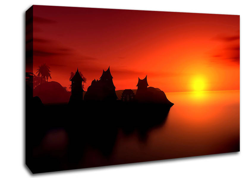 Sunset Village By The Sea Canvas Print handmade in the UK. Stretched over a 2 inch thick wooden box frame, ready to hang on your wall.