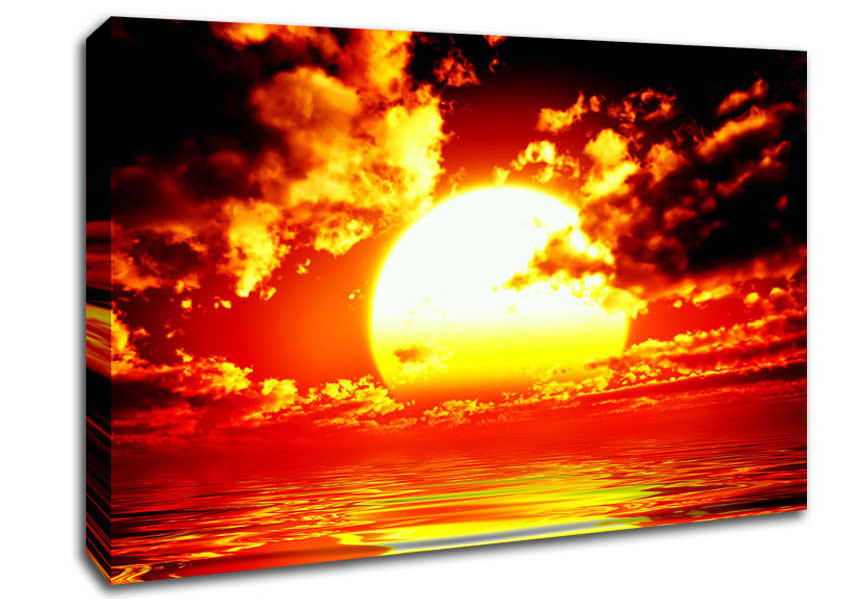 The Huge Sun Over The Ocean Canvas Print handmade in the UK. Stretched over a 2 inch thick wooden box frame, ready to hang on your wall.