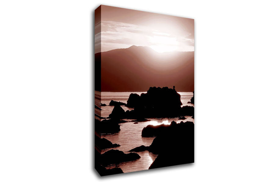 The Suns Mauve Ocean Rocks Canvas Print handmade in the UK. Stretched over a 2 inch thick wooden box frame, ready to hang on your wall.