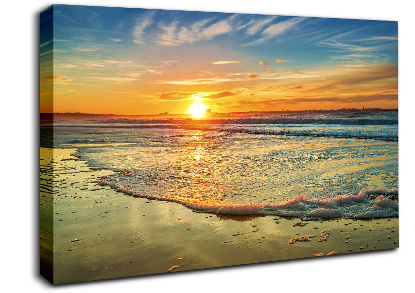 Waves Of The Sunset Ocean Canvas Print handmade in the UK. Stretched over a 2 inch thick wooden box frame, ready to hang on your wall.