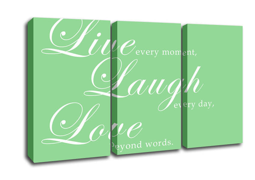 Family Quote Live Laugh Love 2 Green 3 Panel Canvas Print handmade in the UK. Stretched over a 2 inch thick wooden box frame, ready to hang on your wall.