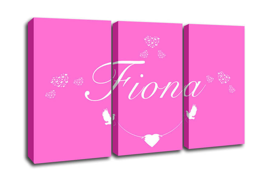 Girls Room Quote Your Name In Hearts Vivid Pink 3 Panel Canvas Print handmade in the UK. Stretched over a 2 inch thick wooden box frame, ready to hang on your wall.