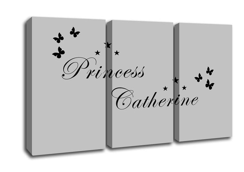 Girls Room Quote Your Own Name Princess Grey 3 Panel Canvas Print handmade in the UK. Stretched over a 2 inch thick wooden box frame, ready to hang on your wall.