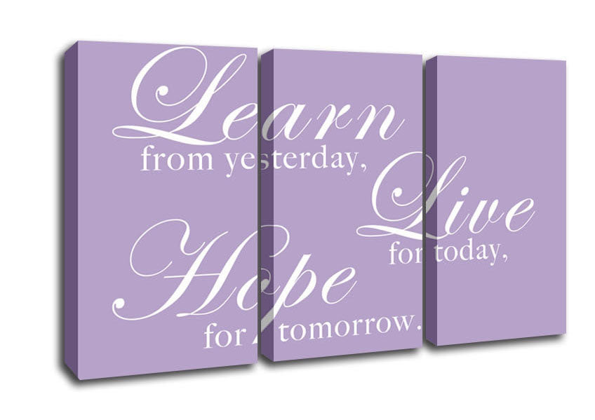 Home Quote Learn Live Hope Lilac 3 Panel Canvas Print handmade in the UK. Stretched over a 2 inch thick wooden box frame, ready to hang on your wall.