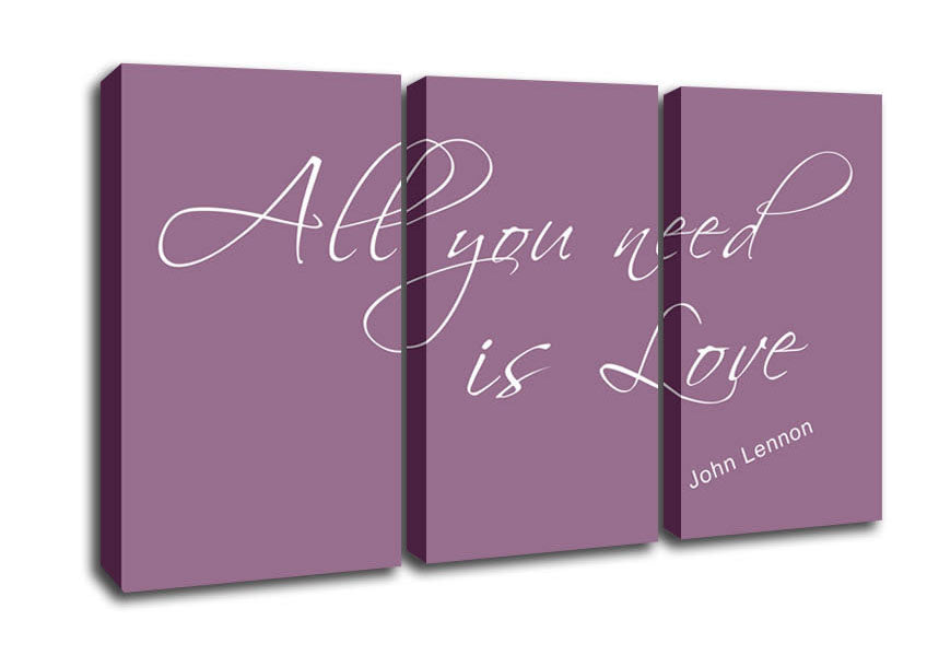 Music Quote All You Need Is Love 2 Dusty Pink 3 Panel Canvas Print handmade in the UK. Stretched over a 2 inch thick wooden box frame, ready to hang on your wall.