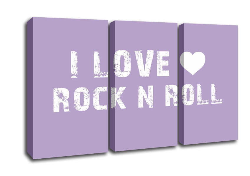 Music Quote I Love Rock N Roll Lilac 3 Panel Canvas Print handmade in the UK. Stretched over a 2 inch thick wooden box frame, ready to hang on your wall.
