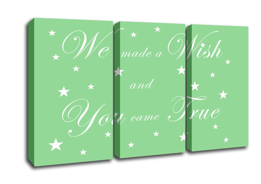 Nursery Quote We Made A Wish And You Came True Green 3 Panel Canvas Print handmade in the UK. Stretched over a 2 inch thick wooden box frame, ready to hang on your wall.