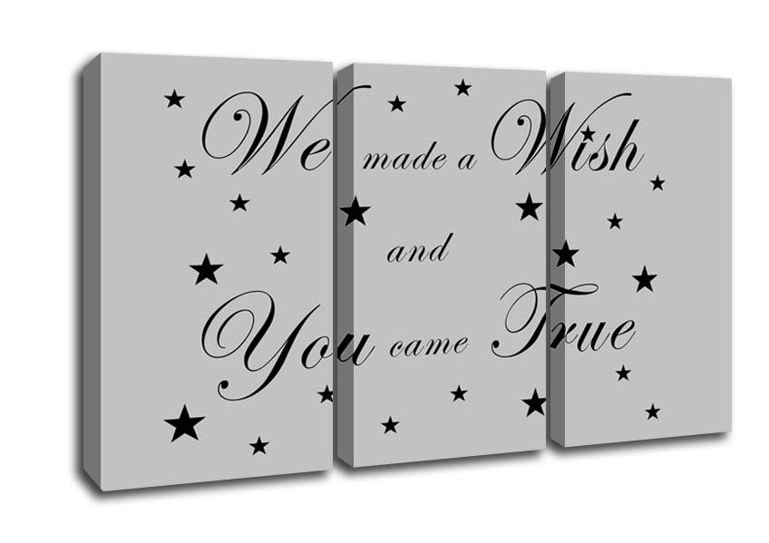 Nursery Quote We Made A Wish And You Came True Grey 3 Panel Canvas Print handmade in the UK. Stretched over a 2 inch thick wooden box frame, ready to hang on your wall.