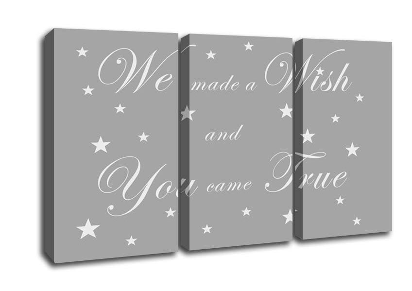 Nursery Quote We Made A Wish And You Came True Grey White 3 Panel Canvas Print handmade in the UK. Stretched over a 2 inch thick wooden box frame, ready to hang on your wall.