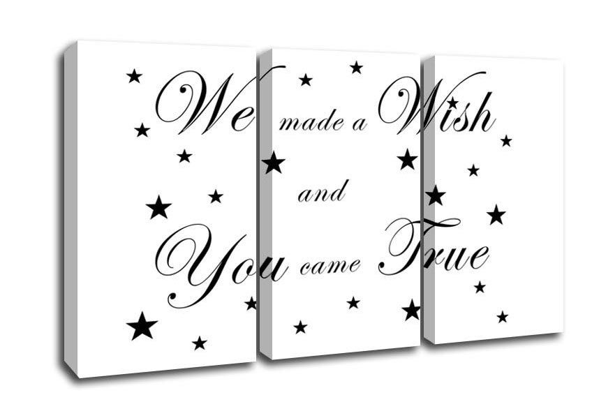 Nursery Quote We Made A Wish And You Came True White 3 Panel Canvas Print handmade in the UK. Stretched over a 2 inch thick wooden box frame, ready to hang on your wall.