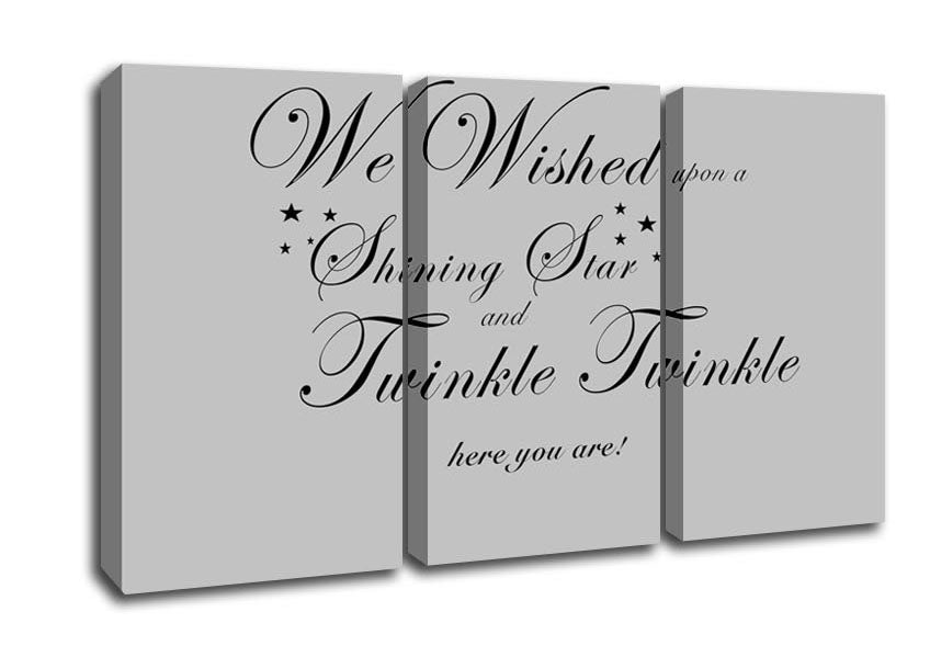Nursery Quote We Wished Upon A Shining Star Grey 3 Panel Canvas Print handmade in the UK. Stretched over a 2 inch thick wooden box frame, ready to hang on your wall.