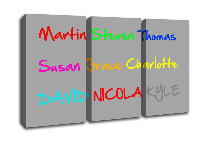 Your Name In A Choice Of Colours Grey White 3 Panel Canvas Print handmade in the UK. Stretched over a 2 inch thick wooden box frame, ready to hang on your wall.