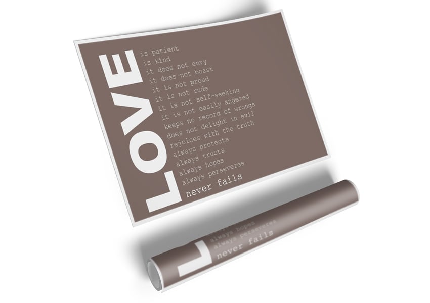 Love Quote Love Never Fails Beige Poster printed on high quality canvas paper, ready to display.
