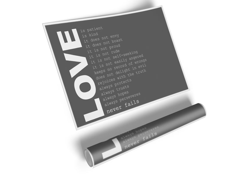 Love Quote Love Never Fails Grey Poster printed on high quality canvas paper, ready to display.
