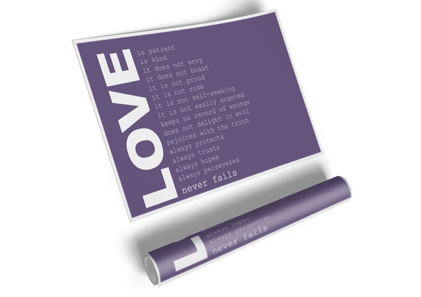Love Quote Love Never Fails Lilac Poster printed on high quality canvas paper, ready to display.