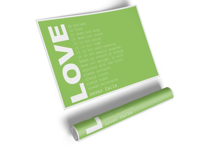 Love Quote Love Never Fails Lime Green Poster printed on high quality canvas paper, ready to display.