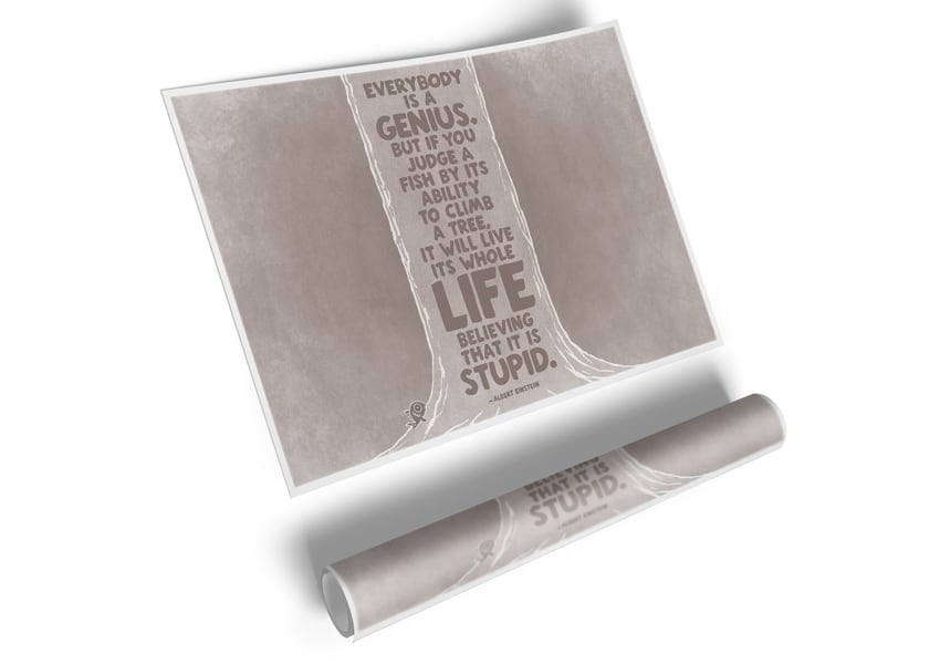Motivational Quote Motivational Quote Albert Einstein Everybody Is A Genius Beige Poster printed on high quality canvas paper, ready to display.