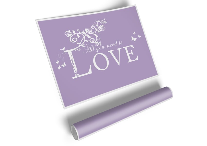 Music Quote All You Need Is Love Lilac Poster printed on high quality canvas paper, ready to display.
