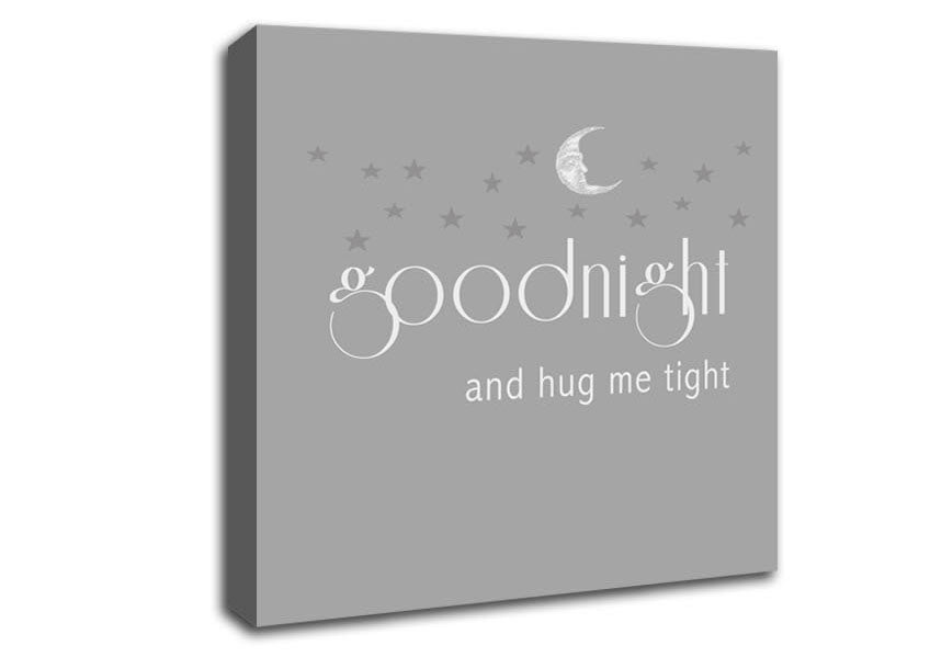 Boys room Quote Good Night And Hug Me Tight Grey White Square Canvas Print handmade in the UK. Stretched over a 2 inch thick wooden box frame, ready to hang on your wall.