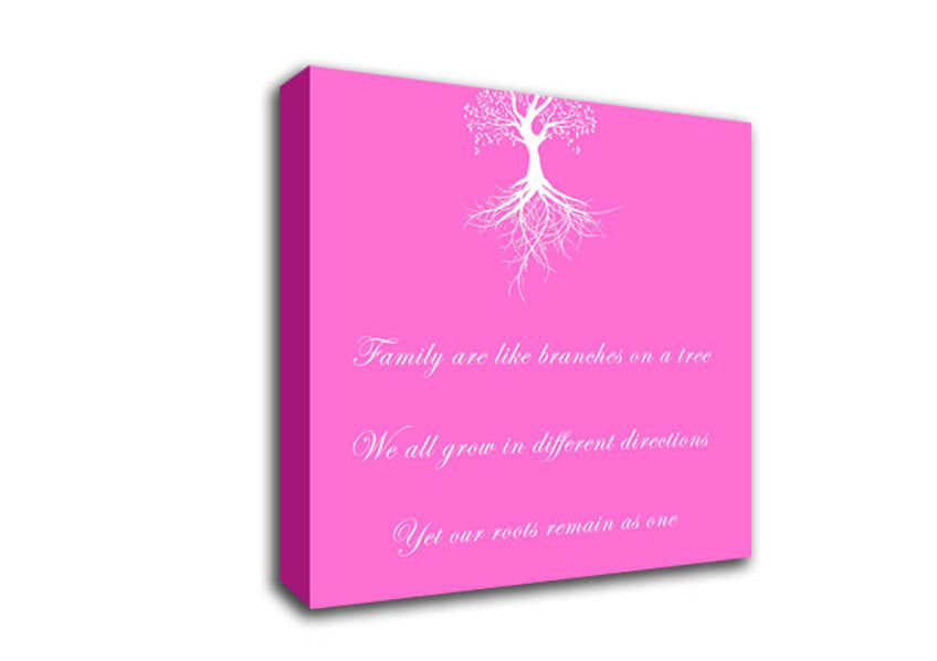 Family Quote Family Are Like Branches 2 Vivid Pink Square Canvas Print handmade in the UK. Stretched over a 2 inch thick wooden box frame, ready to hang on your wall.