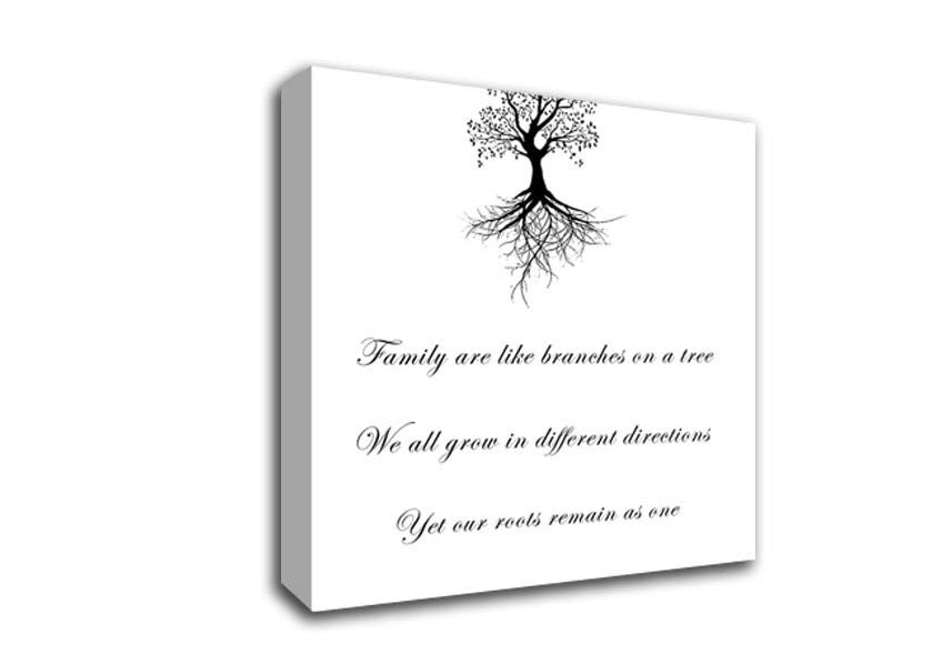 Family Quote Family Are Like Branches 2 White Square Canvas Print handmade in the UK. Stretched over a 2 inch thick wooden box frame, ready to hang on your wall.