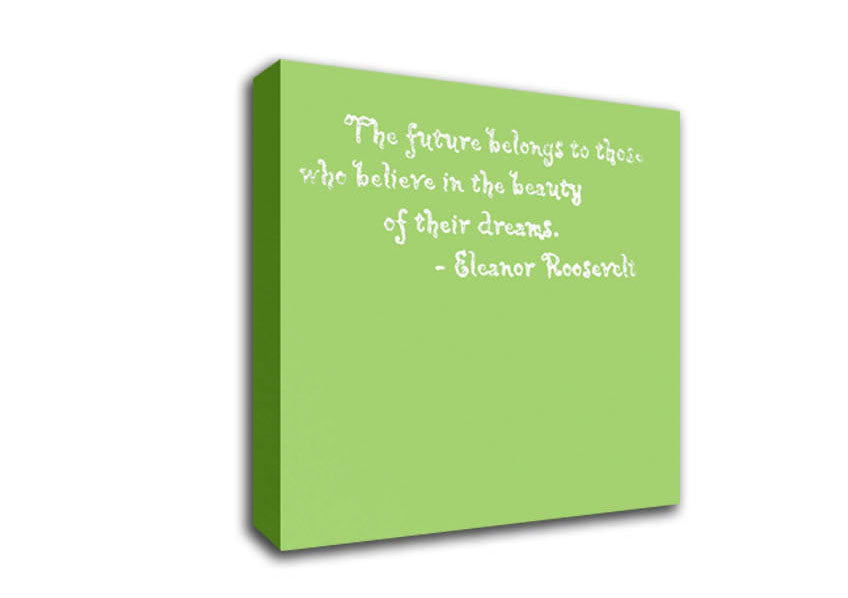 Famous Quote Eleanor Roosevelt The Future Belongs To Those Lime Green Square Canvas Print handmade in the UK. Stretched over a 2 inch thick wooden box frame, ready to hang on your wall.