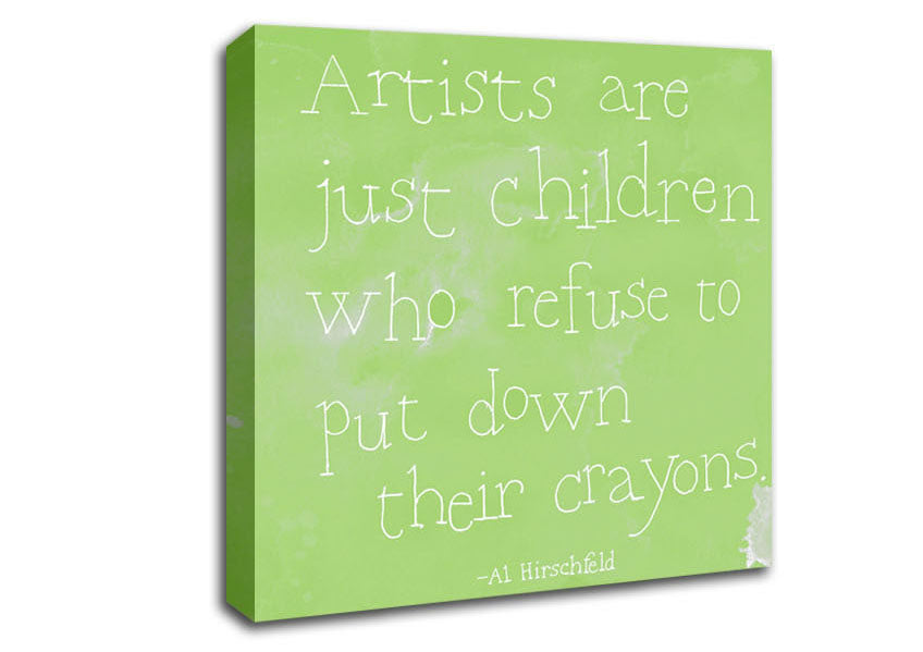 Funny Quote Hirschfeld Artists Are Just Children Lime Green Square Canvas Print handmade in the UK. Stretched over a 2 inch thick wooden box frame, ready to hang on your wall.