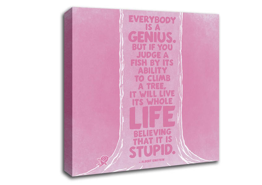 Motivational Quote Albert Einstein Everybody Is A Genius Pink Square Canvas Print handmade in the UK. Stretched over a 2 inch thick wooden box frame, ready to hang on your wall.