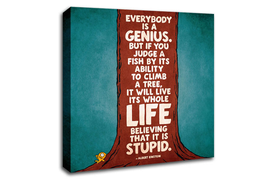 Motivational Quote Albert Einstein Everybody Is A Genius Square Canvas Print handmade in the UK. Stretched over a 2 inch thick wooden box frame, ready to hang on your wall.