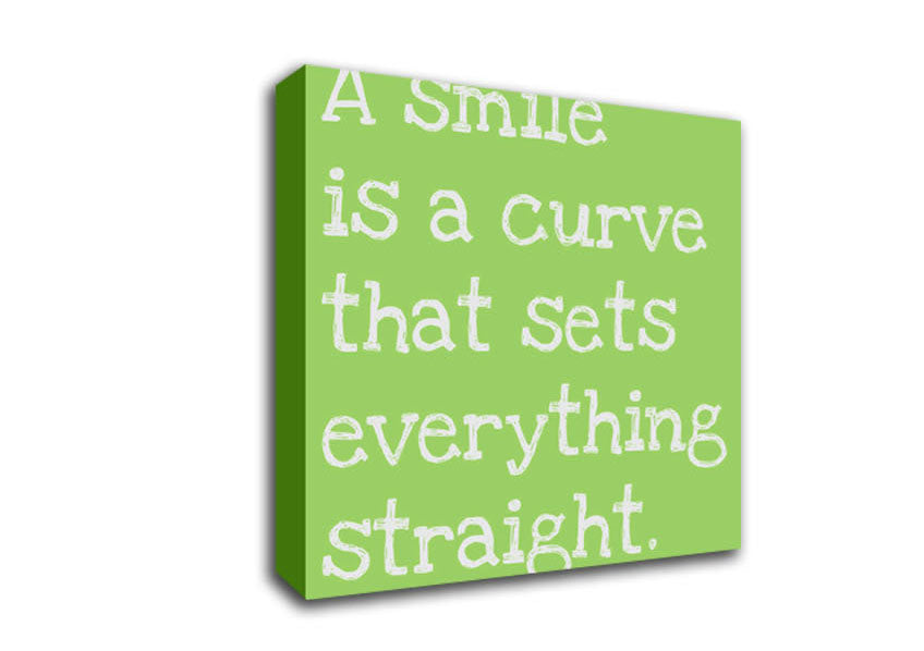 Motivational Quote Smile Is A Curve Lime Green Square Canvas Print handmade in the UK. Stretched over a 2 inch thick wooden box frame, ready to hang on your wall.